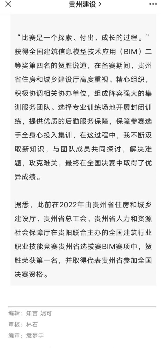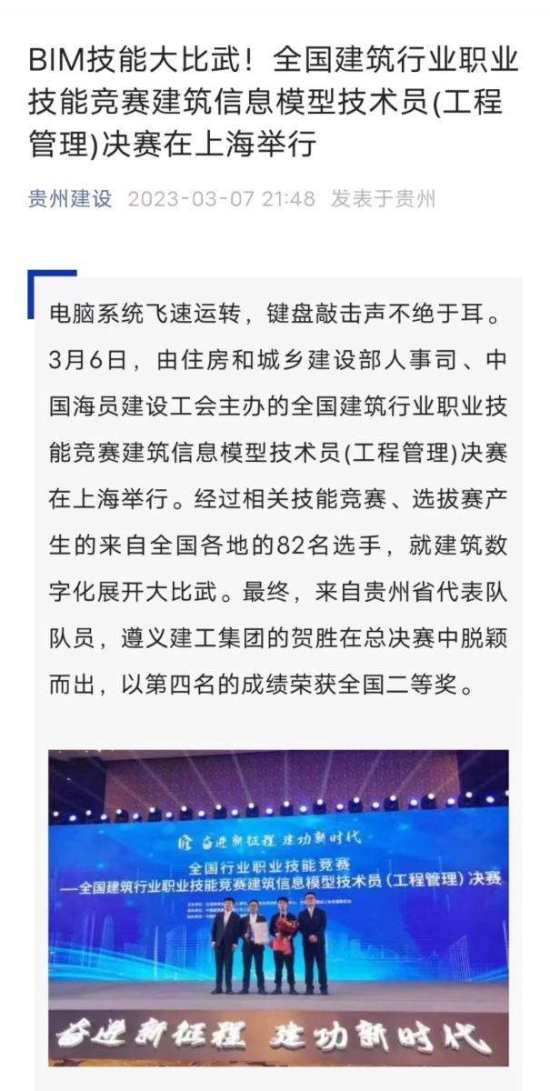 此前,在2022年11月由貴州省住房和城鄉(xiāng)建設廳、貴州省總工會、貴州省人力資源和社會保障廳聯(lián)合舉辦的全國建筑行業(yè)職業(yè)技能競賽貴州省選拔賽中,賀勝就取得了第一名的優(yōu)異成績,被授予“全省住房城鄉(xiāng)建設系統(tǒng)貴州建設工匠”榮譽稱號。此次是代表貴州省在全國決賽中參與角逐。
