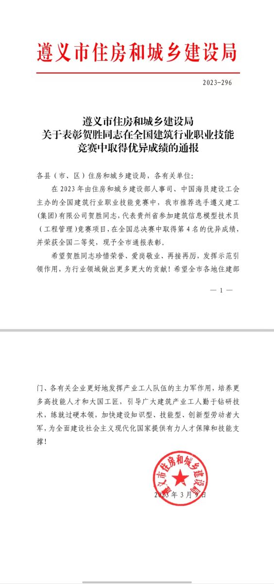 自競賽啟動以來,貴州省住房和城鄉(xiāng)建設廳及(集團)公司領(lǐng)導高度重視,精心組織開展封閉訓練,積極協(xié)調(diào)組成集訓服務團隊,提供優(yōu)質(zhì)后勤保障工作。賀勝同志不負眾望,取得佳績,這不僅體現(xiàn)了個人高超的專業(yè)技能,更為貴州省和遵義市爭得了榮譽。同時,這也是遵義建工(集團)在全國建筑行業(yè)職業(yè)技能競賽中榮獲大獎的突破。